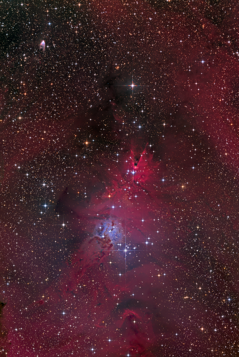 2-panel mosaic of NGC 2261 & NGC 2264 (Christmas Tree Cluster, Fox Fur Nebula, Cone Nebula, Hubble's Variable Nebula)